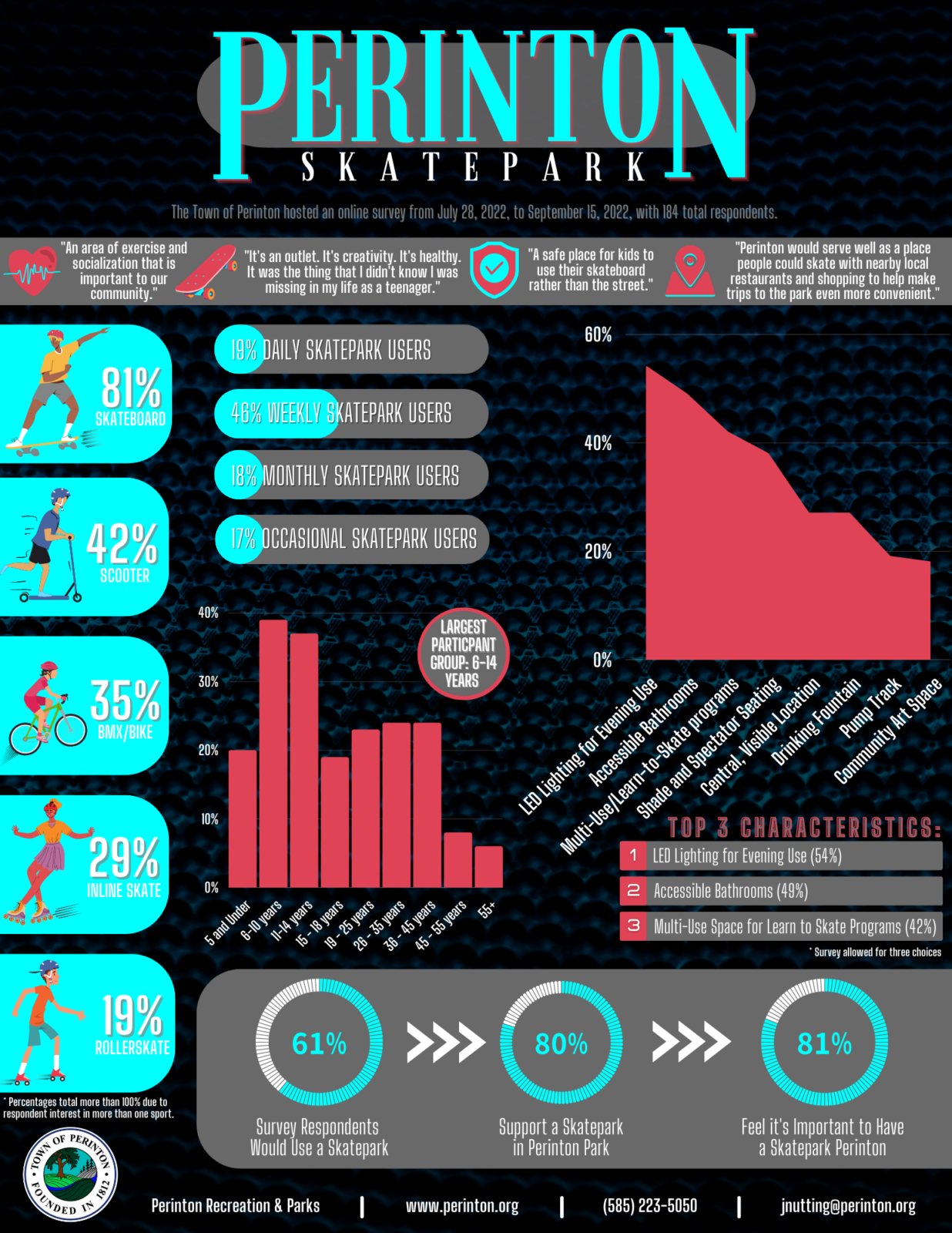 The Perinton Skatepark is located within Perinton Park at 99 O’Connor Road, Fairport, NY 14450. The 43.6-acre park provides direct access to the Erie Canal and the Canalway Trail, making it easily accessible to pedestrians from the Village of Fairport. The skatepark is open year-round, with the same daily hours of operation as Perinton Park, from 8 a.m. to 10 p.m. Operation of the skatepark will be managed by the Town of Perinton Department of Recreation & Parks.